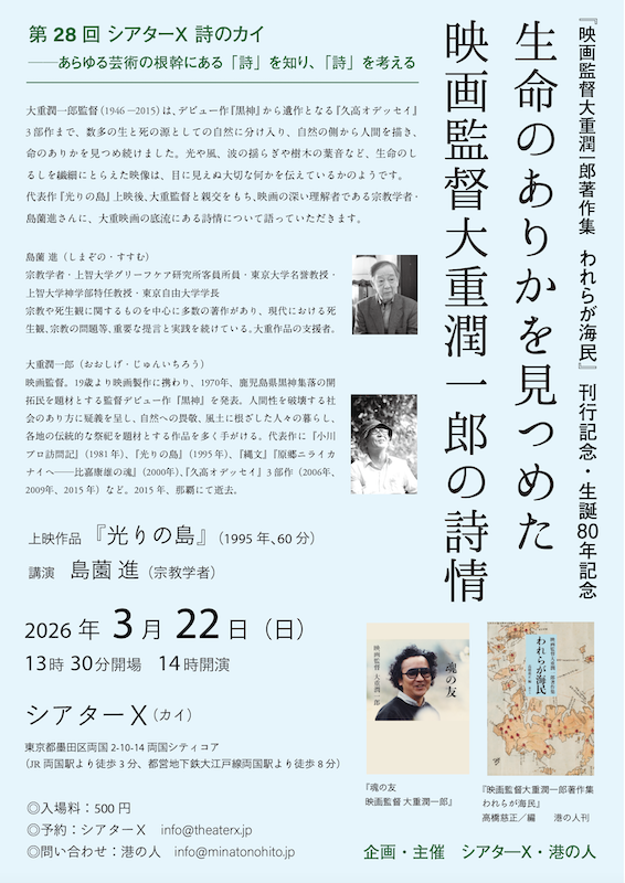 2020年よりシアターカイと港の人が共同で開催している「シアターX 詩のカイ」。次回は「生命のありかを見つめた映画監督大重潤一郎の詩情」と題し、『映画監督大重潤一郎著作集 われらが海民』(2025年、港の人)の刊行記念の会をおこないます。